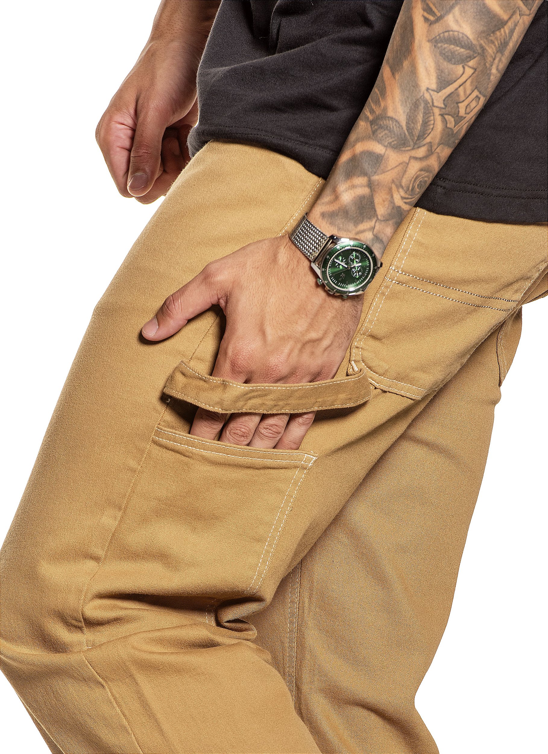 CORTE SOLTO, TECIDO DE SARJA RESISTENTE E COM CONFORTO. BOLSO LATERAL E DETALHE CARPINTEIRO.